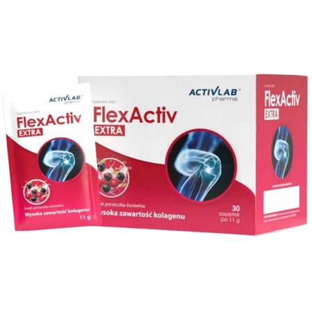 - FlexActive Extra o smaku porzeczkowo-żurawinowym to 10 g kolagenu i witamina C w saszetce. Wspiera stawy, chrząstki i kości. Dla dzieci od 6 lat i dorosłych. Wysokiej jakości hydrolizat kolagenowy gwarantuje doskonałą przyswajalność.