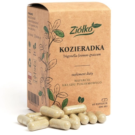 - Suplement diety zawierający zmielone nasiona kozieradki (Trigonella foenum-graecum). Roślina ta jest ceniona za wsparcie procesów trawiennych, utrzymanie prawidłowego pH soku żołądkowego oraz metabolizmu węglowodanów.